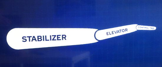 Bild 1. Bilden visar höjdrodrets kontrollflik (control tab) något nedåt (piloten har dragit spaken åt sig lite grand) och därmed har höjdrodet (elevator) rört sig något uppåt (vilket verkar för att långsamt höja nosen).