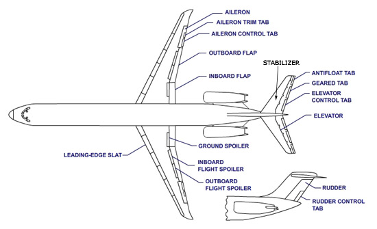 Bild 3. Bilden visar de olika kontrollytorna (control surfaces), dvs roder etc, som finns på DC-9/MD-80. Vi ser här att förutom "elevator control tab" så har vi också "geared tab" och "antifloat tab". Observera att dessa plan också har control tabs på skevrodren (aileron control tabs se nedan). Observera vidare att man har en control tab på sidorodret (rudder control tab). Men denna utgör bara ett reservsystem, eftersom sidorodret på DC-9/MD-80 normalt manövreras hydrauliskt (till skillnad från höjd- och skevrodren).
