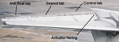 Den flik som sitter längst in (närmast den vertikala fenan) är ovannämnda elevator control tab (som således piloterna manövrerar genom att dra åt sig eller skjuta fram spaken). Utanför denna finns en s k geared tab (också kallad servo tab). Denna har ingen kontakt med piloternas spakar. När kontrollfliken rör sig kommer höjdrodret att börja röra sig. Gear tab är kopplad till ett system av länkarmar, och när höjdrodret rör sig kommer gear tab att påverkas av dessa länkarmar så att den förstärker effekten från kontrollfliken (control tab). På så sätt får man tillräcklig höjdroderverkan vid låg fart och samtidigt relativt små spakkrafter vid högre farter.