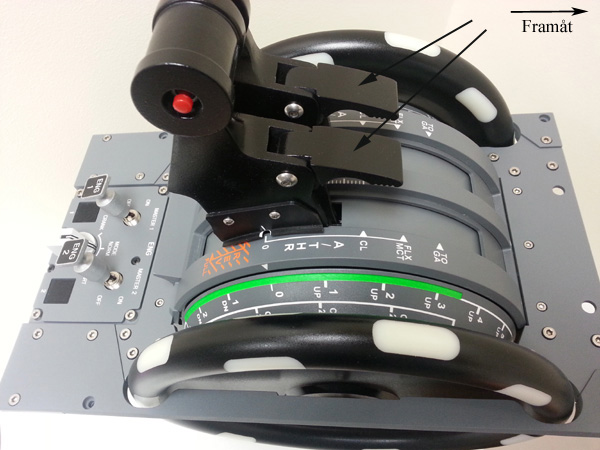 Throttlepanelen (sedd från andrepilotens plats) på Airbus A320 (framåt i flygplanet är åt höger). De två stora, svarta hjulen med vita fält, på var sin sida om throttlehandtagen, är trimhjulen till stabilisatorn (se huvudartikeln om Boeing Max). Den röda knappen på sidan av throttlehandtaget närmast läsaren (det finns en motsvarande knapp på andra throttlehandtaget, vänd bort från läsaren) manövreras med tummen och kallas "auto throttle disengage" (med denna kopplas auto-throttle ur). Försöker man föra throttlehandtagen från 0 till Reverseområdet så går det inte. Man måste först öppna en spärr genom att lyfta de två låsklackarna (utmärkta med svarta pilar) med pek-, lång- och ringfinger. A/THR står för "Auto flight/Thrust", dvs att planet flyger på autopilot och autothrottle eller bara autothrottle.