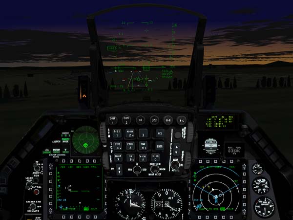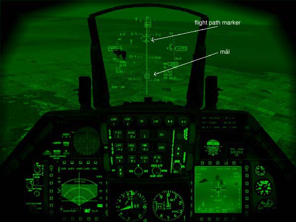 Night vision goggles ger en spöklik men fullt användbar bild av terrängen. Den vänstra MFD:n visar nu markradarbild, medan den högra visar vad den s k "target pod" ser. Target pod är ett slags IR-sikte (infrarött sikte, dvs fungerar även nattetid) för laserbomber. Målet indikeras av den lilla kvadraten på HUD:en. Laserbombfällningen går till så att man flyger mot målet och försöker hålla den lilla flygplanssymbolen (kallas "flight path marker") över det långa vertikala strecket samtidigt som man håller inne en knapp på spaken. FCC (Fire Control Computer) beräknar sedan när bomben skall fällas utifrån information om lufttryck, temperatur, vind på olika höjder, planets fart, dykvinkel etc. Bomben faller först fritt ballistiskt, men 8 sekunder före träff tänds lasern och leder bomben exakt på målet (lasern lyser inte hela tiden, eftersom det skulle ge fienden en förvarning denna tid kan man själv välja, ju exaktare man styr planet, desto mindre behöver bombens bana korrigeras av den laserguidade styrmekanismen). Laserbomber träffar med en noggrannhet av någon meter.