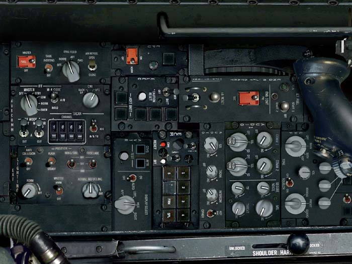 En annan interiörbild från F-16 cockpit. De flesta av knapparna och rattarna fungerar. Bilderna är hämtade från en cockpit i 1600x1200 upplösning (1024x768 har hittills varit det normala på PC 800x600 på Mac). I och med kraftfulla grafikkort och datorer har det börjat bli möjligt att köra Falcon 4 i den upplösningen, vilket ger en dramatisk ökning av bildkvaliteten.