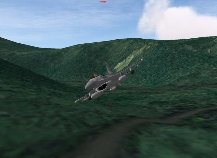 En lågflygande F-16 beväpnad med 2 Mk-84, 2000 lbs (ca 1 ton) "dumma" bomber (dvs bomber som bara faller fritt utan att styras efter att de släppts). Innanför bomberna sitter på varje vinge en fälltank. För självförsvar finns 2 AMRAAM (medeldistans radarstyrda luftmålsrobotar sitter på vingspetsarna) samt 2 Sidewinder IR(värme)-styrda luftmålsrobotar. Under flygkroppen hänger en ECM-kapsel (Electronic Counter Measure), vilken försvårar för fientlig radar att låsa. Position: någonstans i norra Korea.