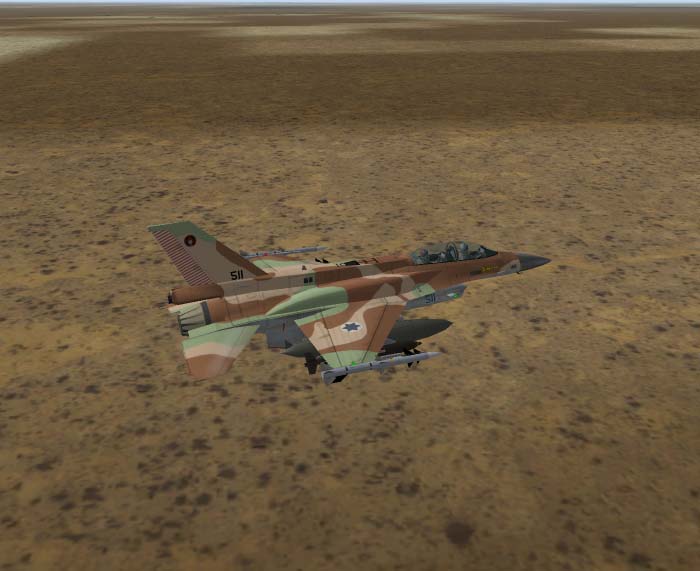 I FF3 finns mängder av nya flygplanstyper. Ovan ser vi en toppmodern, tvåsitsig, israelisk F-16i, med konforma kroppstankar (utbuktningarna på sidorna ökar den interna bränslelasten betydligt och ger således väsentligt bättre räckvidd) på låg höjd över ökenlandskap (från en teater som heter ODS 512 Operation Desert Storm 512 och som täcker hela Mellanöstern från Iran till Medelhavet).Det är fullt möjligt att kombinera ovanstående uppgraderingar. Man kan först installera SP4 sedan ovanpå detta FF3 och till slut BMS. De olika teatrar som gjorts för Falcon 4.0 (Vietnam, Europa, Balkan, Panama, Operation Desert Storm m fl) har uppgraderats så att de numera går att köra på SP4, FF3 och BMS.