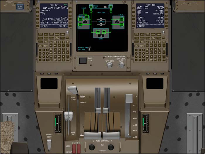 Throttlekonsolen med flight management computers på PMDG:s Boeing 777. De två räknedosliknande sakerna är kaptenens och styrmannens FMC (Flight Management Computer). Där programmerar man in färddata, planvikt, etc. Datorn flyger sedan planet hela vägen från start till landning, använder själv alla tillgängliga navigeringshjälpmedel etc. Planet kan till och med landa självt. Man kan ställa in vilken ekonomifaktor man vill ha på flygningen (mest ekonomiskt ger lägst fart etc). Bara att lära sig FMC:n tar tiotals timmar, även för den som i princip kan flygnavigering etc. Displayen mellan FMC:na kallas "lower EFIS" och visar olika data om planet. Man kan få upp en sida som visar alla dörrar på planet, vilka som är öppna, vilka som är armerade etc. Man kan ta fram en sida som visar status på alla hydraulsystem ombord, etc, etc. Precis som på en riktig 777. På bilden visas översikt av bränslesystemet, med kvantitet i olika tankar, status på bränslepumpar, bränsletemperatur m m.