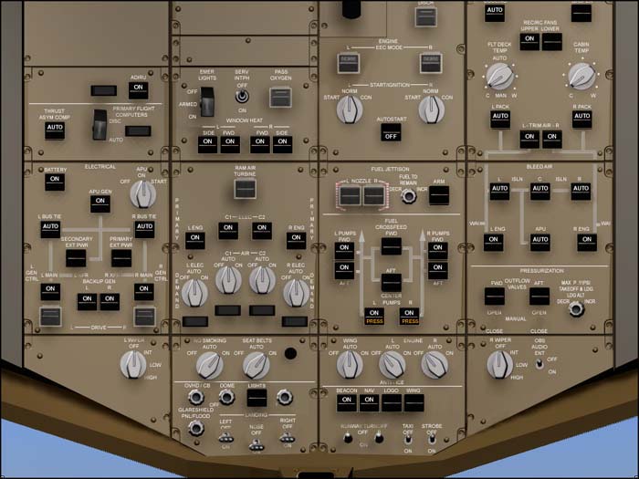 Takpanelen i samma plan. Här ställer man in luftkonditionering, belysning, bränslesystem, elsystem. Vid motorstart använder man också denna panel. Knappar och rattar är logiskt placerade och visar hur systemen är uppbyggda.