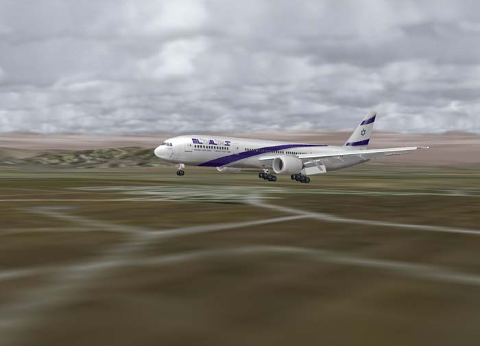 PMDG:s Boeing 777 i El Al's (Israels stora flygbolag) färger strax före landning på en liten flygplats i Puerto Rico. Observera hur klaffarna är fullt ute, och hur huvudlandningsstället (med trehjulig boggie) hänger snett, precis som i verkligheten.