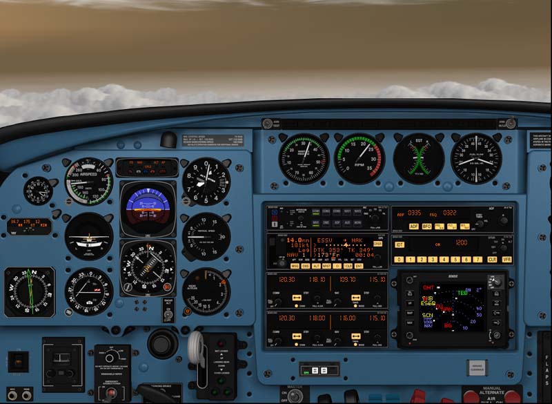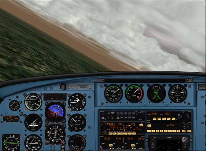 Ett av mina favoritplan i Fly!2, Piper Navajo, (finns på CD:n) under vänstersväng. Alla knappar etc fungerar. GPS och radios fungerar precis som i verkligheten. Personligen tycker jag Navajon kanske är det plan i Fly!2, som har de mest realistiska flygegenskaperna.
