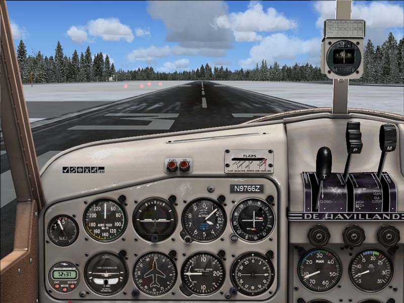 En skärmdump från FSX. Bilden visar instrumentpanelen på en de Havilland Beaver (originalplan i FSX). Originalplanens paneler i FSX är betydligt snyggare och mer realistiska än vad som gäller för FS9.