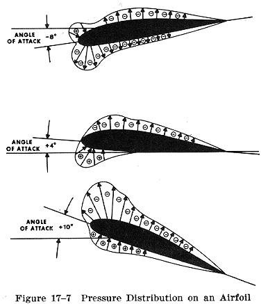 Bilden visar tryckfördelningen runt en vingprofil för tre olika anfallsvinklar (angle of attack). Vi ser här tydligt hur lyftkraften ökar med anfallsvinkeln. Observera att de uppåtriktade kraftvektorerna på vingens ovansida inte är resultatet av den felaktiga modellen ETT (Equal Transit Time), enligt vilken luften som strömmar längs den mer krökta ovansidan får högre fart på grund av den längre sträckan där (vilket enligt Bernoullis lag ger ett lägre tryck på ovansidan som suger upp vingen). Större delen av dessa uppåtriktade krafter är i stället resultatet av att vingen accelererar luft nedåt (enligt diskussionen ovan). Detta ger ett lägre tryck på vingens ovansida, vilket i sin tur, enligt Bernoullis lag, ger luftströmmen på ovansidan en högre fart. Dvs det är lyftkraften (skyfflandet av luft nedåt) och inte vingens större krökning på ovansidan, som genererar det mesta av den högre farten hos luftströmmen över vingen.