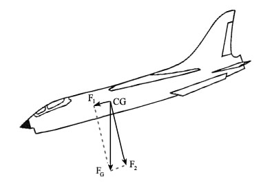 Vi betraktar nu först enbart FL och FG. FL representerar fortsättningsvis summan av de olika vertikala luftkrafterna med ett undantag. Stabilisatorns kraftverkan separerar vi från de andra krafterna och kallar denna FS. FL och FG kommer att ge ett vridmoment på flygkroppen som vill vrida planet moturs (sett från betraktaren), dvs nosen kommer att sänkas och stjärten höjas. Det spelar ingen roll vilken vridningsaxel vi väljer (ett flygplan har ju, till skillnad från t ex ett bilhjul, ingen fast, självklar rotationsaxel). Det mest naturliga är att välja CG som vridningsaxel. Eftersom FG verkar i CG, har denna kraft ingen momentarm relativt denna punkt (det är ju själva definitionen av tyngdpunkten, enligt ovan) och orsakar inget vridmoment. FL, däremot, befinner sig på ett visst avstånd från CG, bakom denna punkt, och ger ett vridande moment (kring CG) riktat moturs (vill dra upp stjärten och sänka nosen).