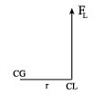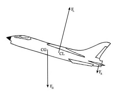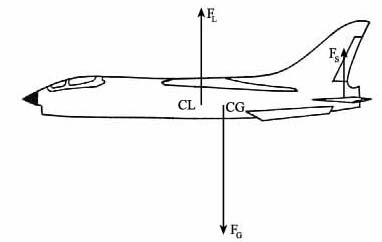 Bild 4. Här ligger tyngdpunkten CG bakom lyftkraftcentrum CL. FS måste i detta fall vara riktad uppåt för att balansera FL:s vridmoment (se texten nedan). Den senare kraften vill rotera planet medurs (höja nosen) kring CG medan FS vill rotera planet moturs (sänka nosen) relativt samma punkt.