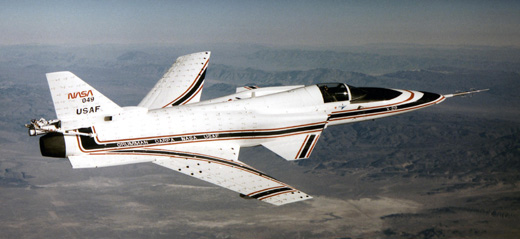 Bild 5. Grumman X-29. Ett experimentplan där man testade framåtsvepta vingar (under perioden 1984-1992). Planet hade mycket stor manöverförmåga men visade sig vara extremt instabilt. Datorsystemet fick korrigera rodren ca 40 gånger per sekund för att hålla planet inom flight envelopen.