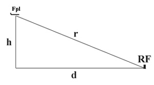 Bild 2: DME-fyren betecknas RF och flygplanet Fpl. Flygplanets höjd över radiofyren kallar vi h och d är kartavståndet till fyren medan r, slutligen, är DME-avståndet.