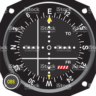 Så här kan ett CDI-instrumentet på ett mindre flygplan se ut. Man ställer in den kurs man vill flyga (den "avbrutna" pilen på instrumentet kallas course pointer) mot eller från VOR-fyren (man kan alltså även använda en VOR för att flyga bort från den kallas "back track"). Denna inställning görs med en ratt (kallas CRS=course vänstra ratten i bilden). På bilden pekar course pointer i riktning 355° (lite svårt att se kanske). Vi ser att mitten av course pointer "saknas". Den del av course pointer som saknas (en linje) ligger i figuren till höger om course pointer och är parallell med denna. Denna del av course pointer kallas deviation indicator. Denna visar att vi ligger till vänster om den önskade kurslinjen (deviation indicator visar var den önskade tracken ligger i förhållande till det egna flygplanet) Vi måste således mer till höger relativt den önskade tracken (den kurs planet har, 54°, gör att vi är på väg mot radialen). När man börjar närma sig den önskade radialen till fyren (355°) börjar deviation indicator röra på sig och närmar sig course pointer (pilen) och man svänger då upp mot fyren (åt vänster i den riktning pilen pekar om man skall flyga mot fyren). De vita, korta strecken i mitten (kallas dots) anger hur mycket fel man ligger. Normalt finns 5 dots på varje sida om mitten. Varje streck svarar mot 2°. Ligger man mer än 10° fel så ligger deviation indicator i sitt extrema ytterläge. När felet blir mindre än 10° börjar deviation indicator att röra sig mot mitten. Just nu ligger ju planet på kurs 54° (DC-strecket rakt upp). Har man ställt autopiloten i läge VOR, kommer den automatiskt att "fånga upp" bäringen och börja flyga mot fyren på rätt kurs (355°) när deviation indicator börjar närma sig mitten. Deviation indicator kommer då att ligga ens med course pointer dvs pilen blir så att säga "hel". Den högra ratten styr autopilotens kurshållning (heading) och används för att styra planet mot radialen.