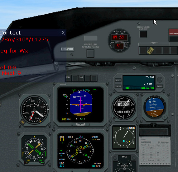 Och här slutligen har vi i stort sett fångat upp radialen (319° mot fyren) och flyger nu på radialen mot fyren (på rätt kurs). Vi ligger något till höger om tracken och dessutom så pekar inte course pointer rakt fram utan lite till höger om nollstrecket. Det sistnämnda beror på att det är stark sidvind från höger, vilket autopiloten måste kompensera för (genom att hålla upp några grader mot vinden). En autopilot gör inga bryska manövrer varför man vid byig vind dessutom kan ligga lite fel. Men felet har ingen betydelse för navigeringen. Även en mänsklig pilot undviker f ö bryska manövrer och accepterar att man ligger lite fel.