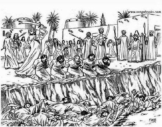 This is how the cartoonist imagines the massacre of one of Medina's Jewish tribes. Muhammad sits on his "throne" on the far right and enjoys the spectacle. After all, it was he who gave the order for them to be executed. This event is depicted in quite some detail in Muslim historiography and muslims are not ashamed, but rather proud of it. The wives and children of the murdered Jewish men were enforced to witness the massacre and the wives were then married off to a Muslim or became slaves together with the children. This massacre is also briefly mentioned in the Quran (Sura 33:26). Read more about this here (sök på ordet "Medina")!